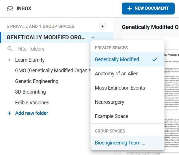 Elumity organizes all content within "Spaces" - dedicated work environments that can be either private or collaborative.