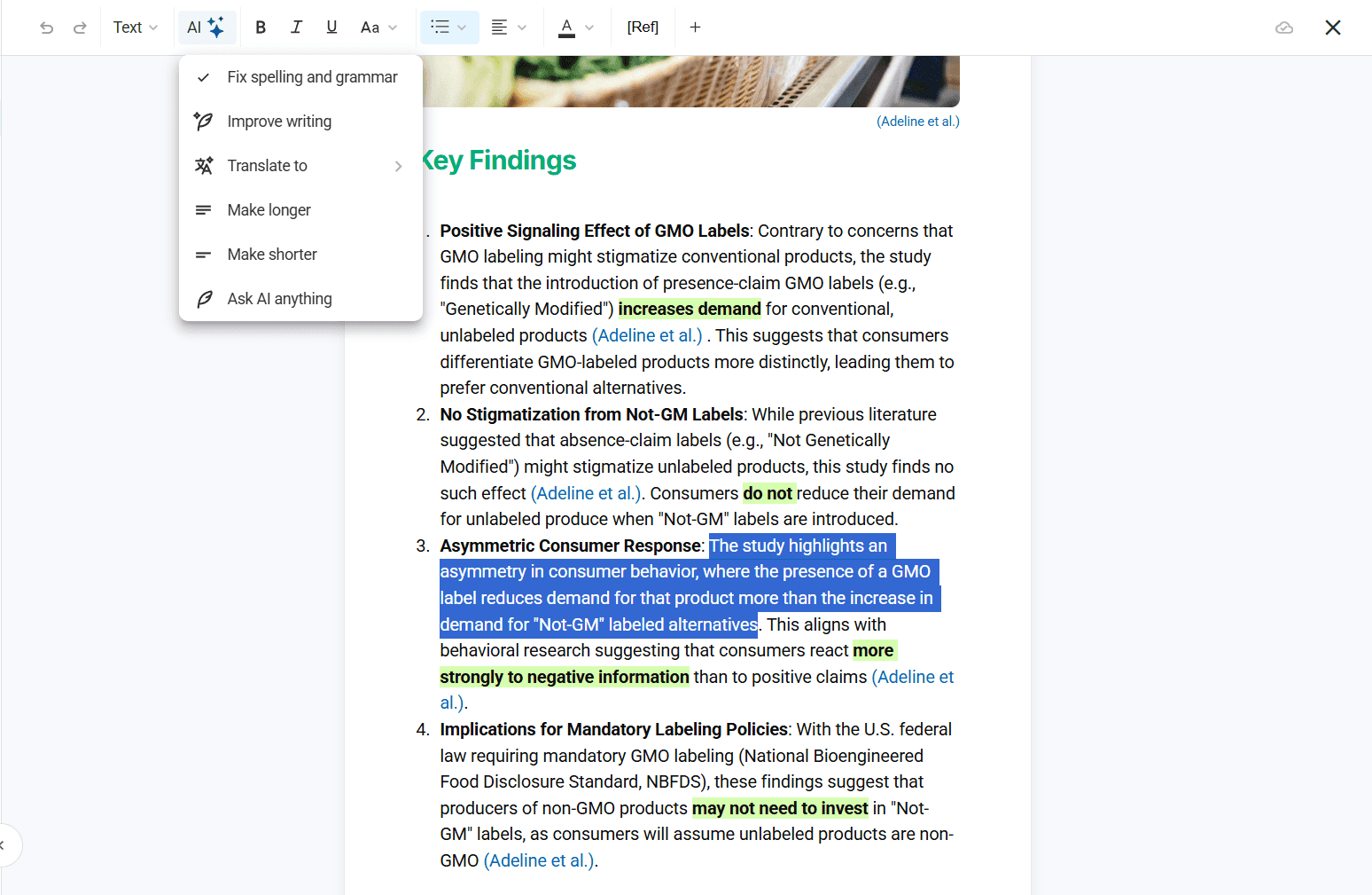 - Reference Integration: Direct citation addition and academic source linking