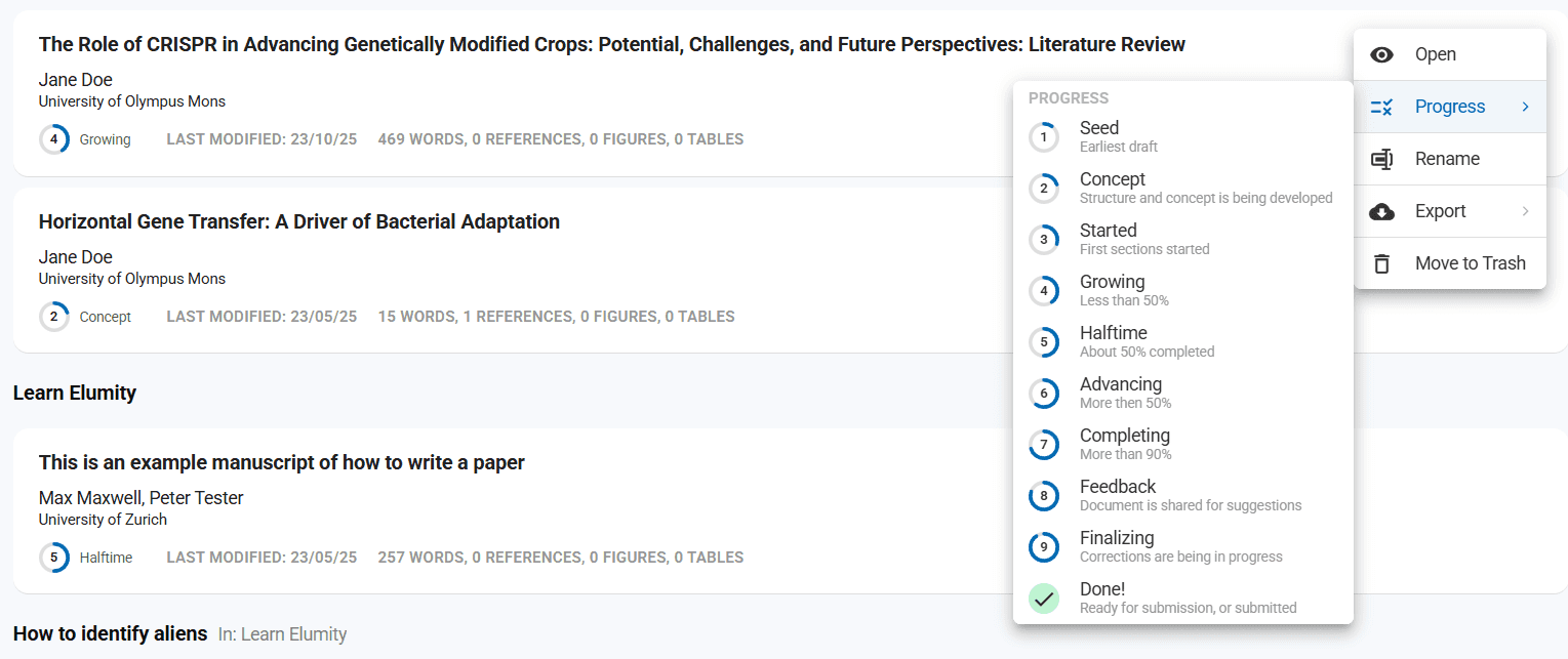 Elumity's user interface is built around the concept of interconnected workflows rather than isolated tools. Every element is designed to maintain context and relationships between your research materials, extracted knowledge, and written outputs. This guide will help you understand how to navigate efficiently and leverage the platform's integrated design.