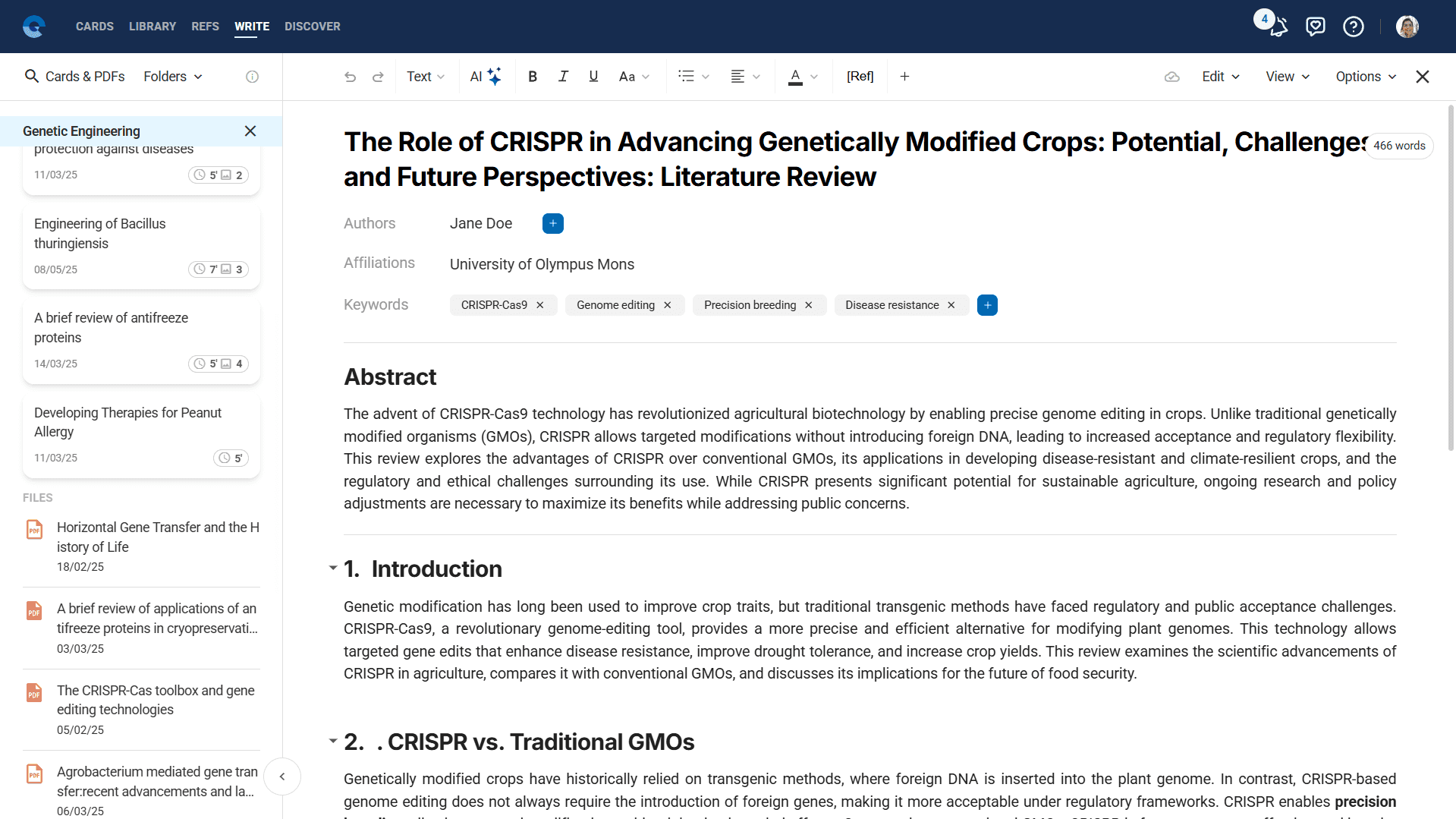 - Main Writing Area: Full-featured text editor with academic formatting