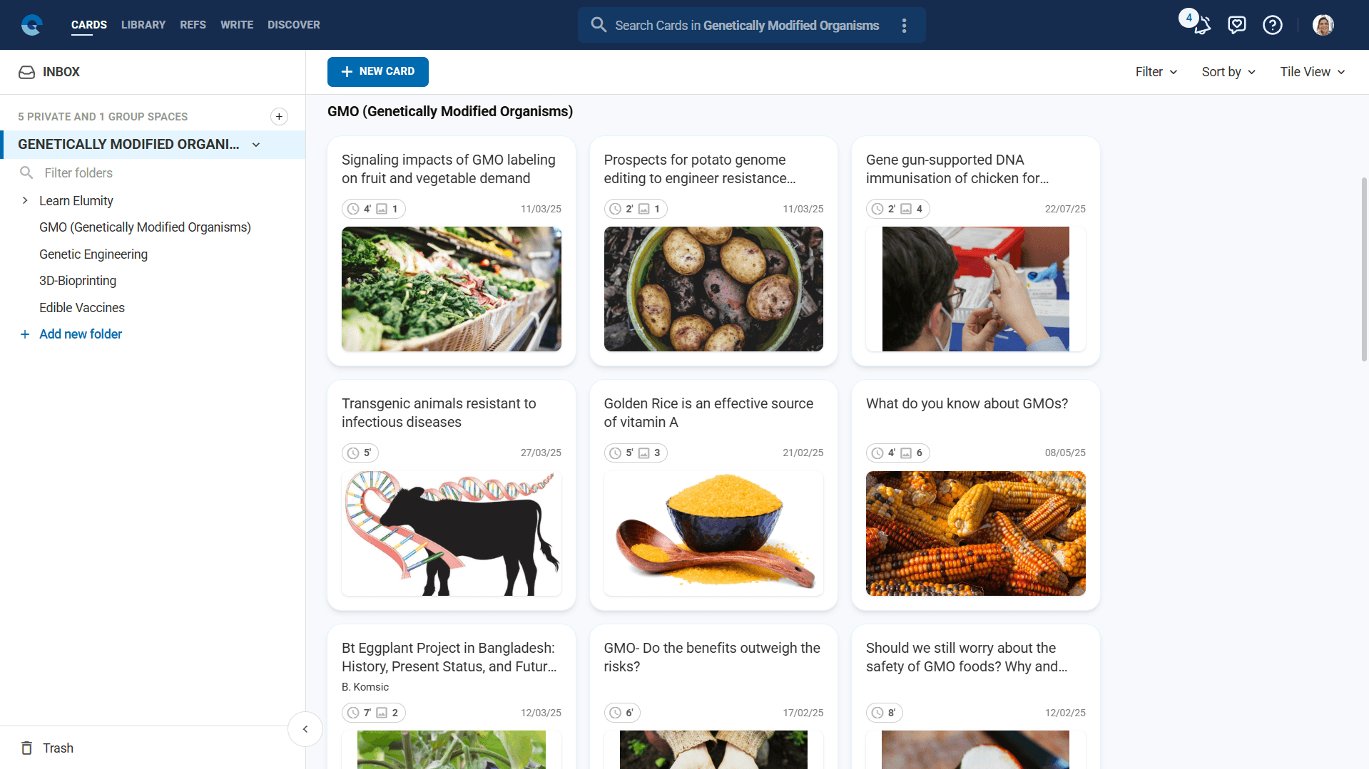 - Tile View: Grid display showing card titles, reading time, image count, creation date, and cover images