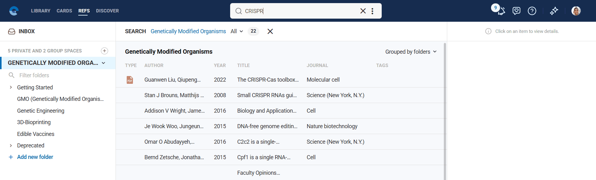 Access your references through the References module in the main navigation. Your reference collection appears as a searchable list showing essential information for each source: authors, title, publication year and journal or publisher.