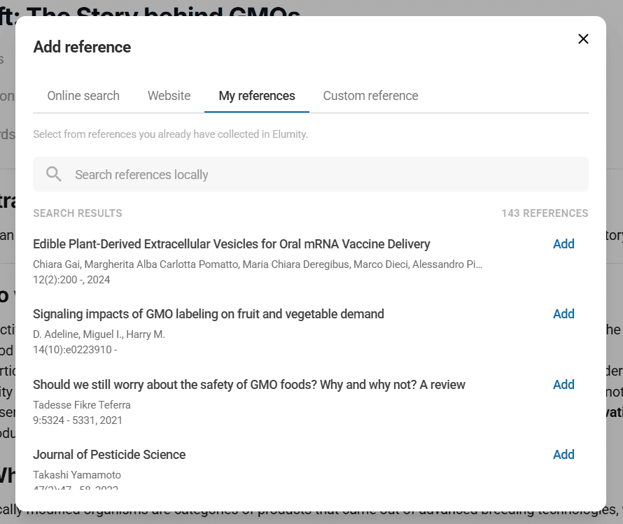 References integrate with Elumity's Write module, where your carefully curated reference library becomes the foundation for accurate academic citations.
